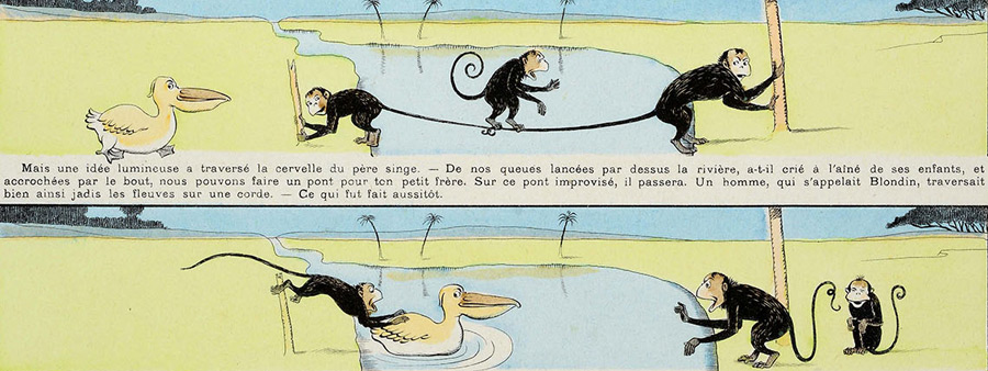 Les Singes et le Pélican poursuivis par le Serpent enragé (détail), Benjamin Rabier | Zincographie coloriée au pochoir éditée par l’Imagerie Pellerin, Épinal, 1897 | © Coll. Musée de l’image
